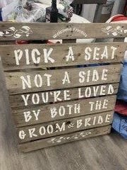 Whether you're planning an outdoor garden wedding or a cozy indoor celebration, our Pick A Seat Pallet is the perfect choice to enhance your wedding decor. Its versatile design blends seamlessly with any theme, adding a warm and inviting atmosphere to your venue.